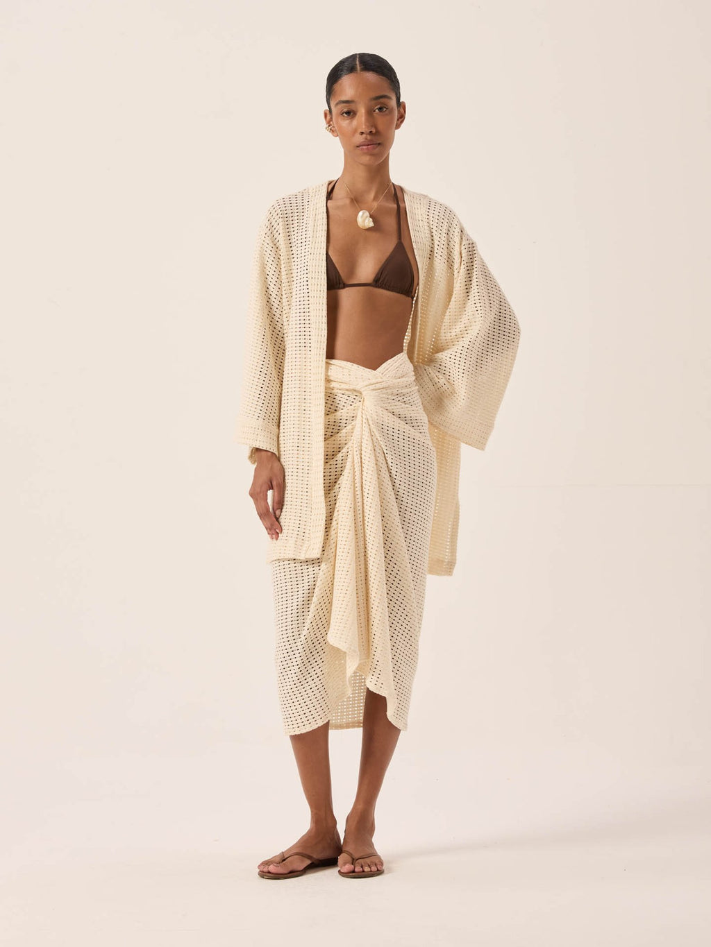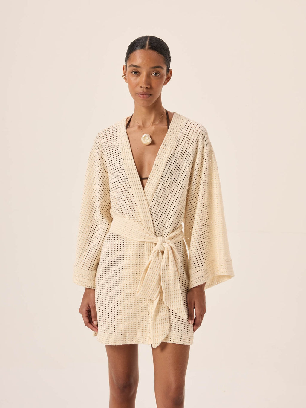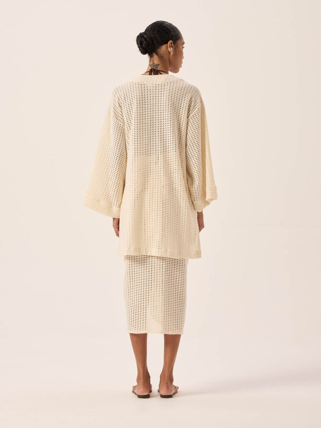 Kimono de shape amplo, confeccionado em tecido leve e vazado, com textura delicada que garante frescor e movimento. Possui pala estruturando o caimento, mangas 7/8 amplas e comprimento versátil, ideal para sobreposições elegantes.