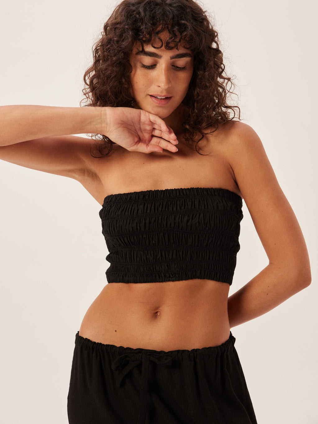 O top reto em tricoline com lastex largo por toda a peça se ajusta perfeitamente ao corpo, valorizando as curvas com conforto e sustentação. O franzido cria textura e garante segurança no uso sem alças, enquanto o comprimento cropped traz um ar moderno e feminino.