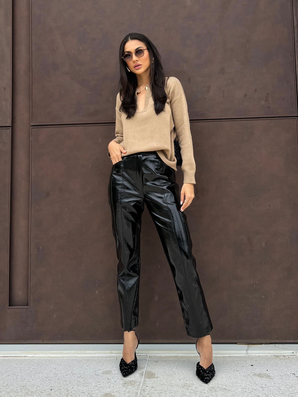 Blusa em tricot manga longa, com detalhe dourado no pescoço e decote v.