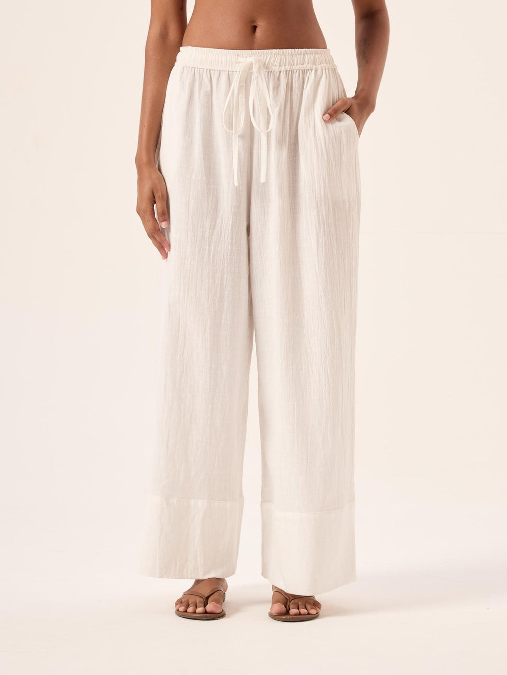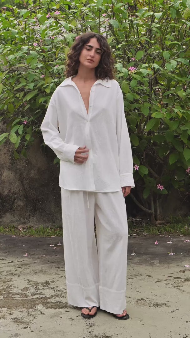 Calça ampla tipo pantalona confeccionada em algodão, com toque leve, natural e caimento fluido. Possui cós de elástico com amarração em rolotê, que garante ajuste confortável ao corpo e praticidade no vestir. Os bolsos laterais trazem funcionalidade ao design, enquanto a pala larga na barra adiciona acabamento sofisticado e movimento à peça.
