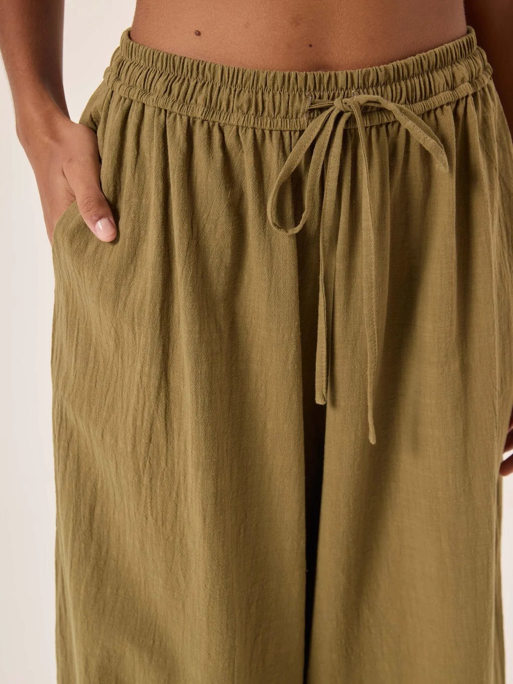 Calça ampla tipo pantalona confeccionada em algodão, com toque leve, natural e caimento fluido. Possui cós de elástico com amarração em rolotê, que garante ajuste confortável ao corpo e praticidade no vestir. Os bolsos laterais trazem funcionalidade ao design, enquanto a pala larga na barra adiciona acabamento sofisticado e movimento à peça.