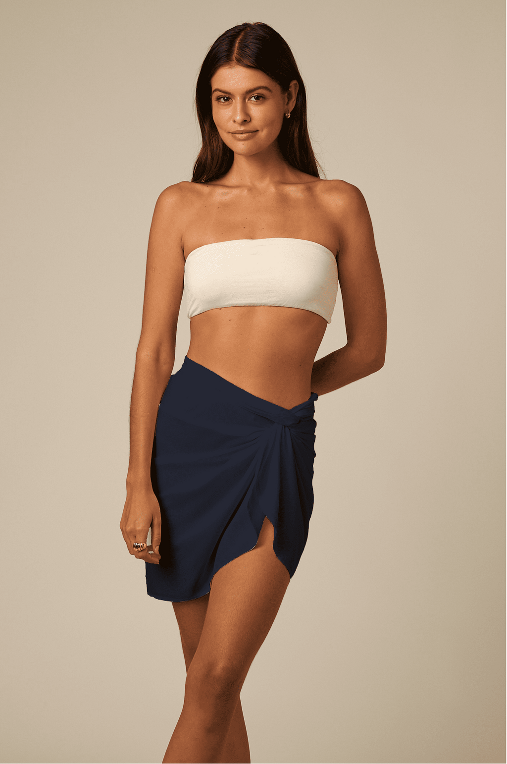 Saia curta tipo pareô confeccionada em viscose, com toque leve, fluido e caimento delicado sobre o corpo. Possui faixa dupla fixa que permite três formas diferentes de amarração: transpassada, lateral ou cruzada, oferecendo versatilidade e diferentes propostas de styling em uma única peça.