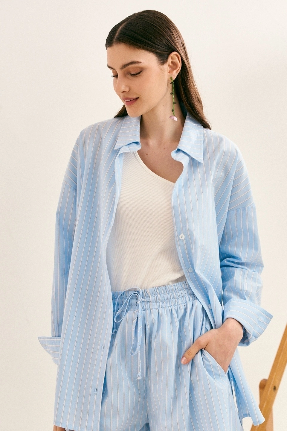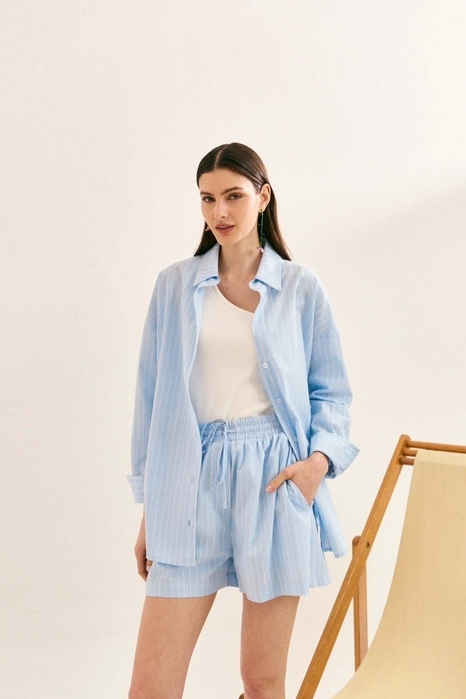 O conjunto em tricoline 100% algodão traduz o luxo descomplicado dos dias de sol. A camisa de modelagem solta cria movimento e frescor, perfeita para usar aberta, fechada ou como terceira peça — sempre com uma estética effortless. O short, todo forrado, com cós de elástico e amarração, traz conforto absoluto e um caimento leve, equilibrando casualidade e sofisticação.