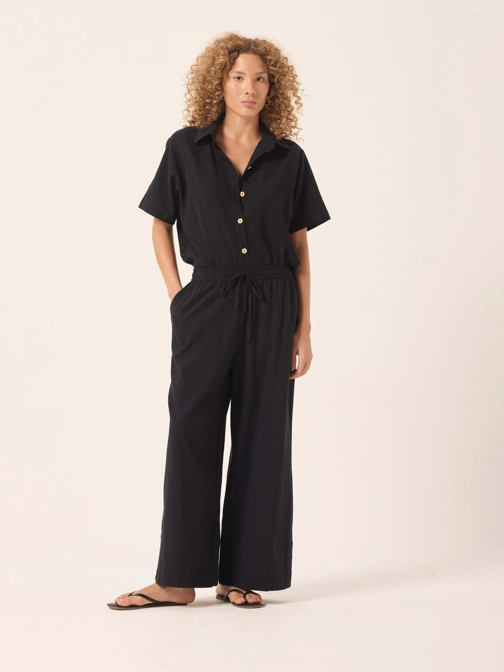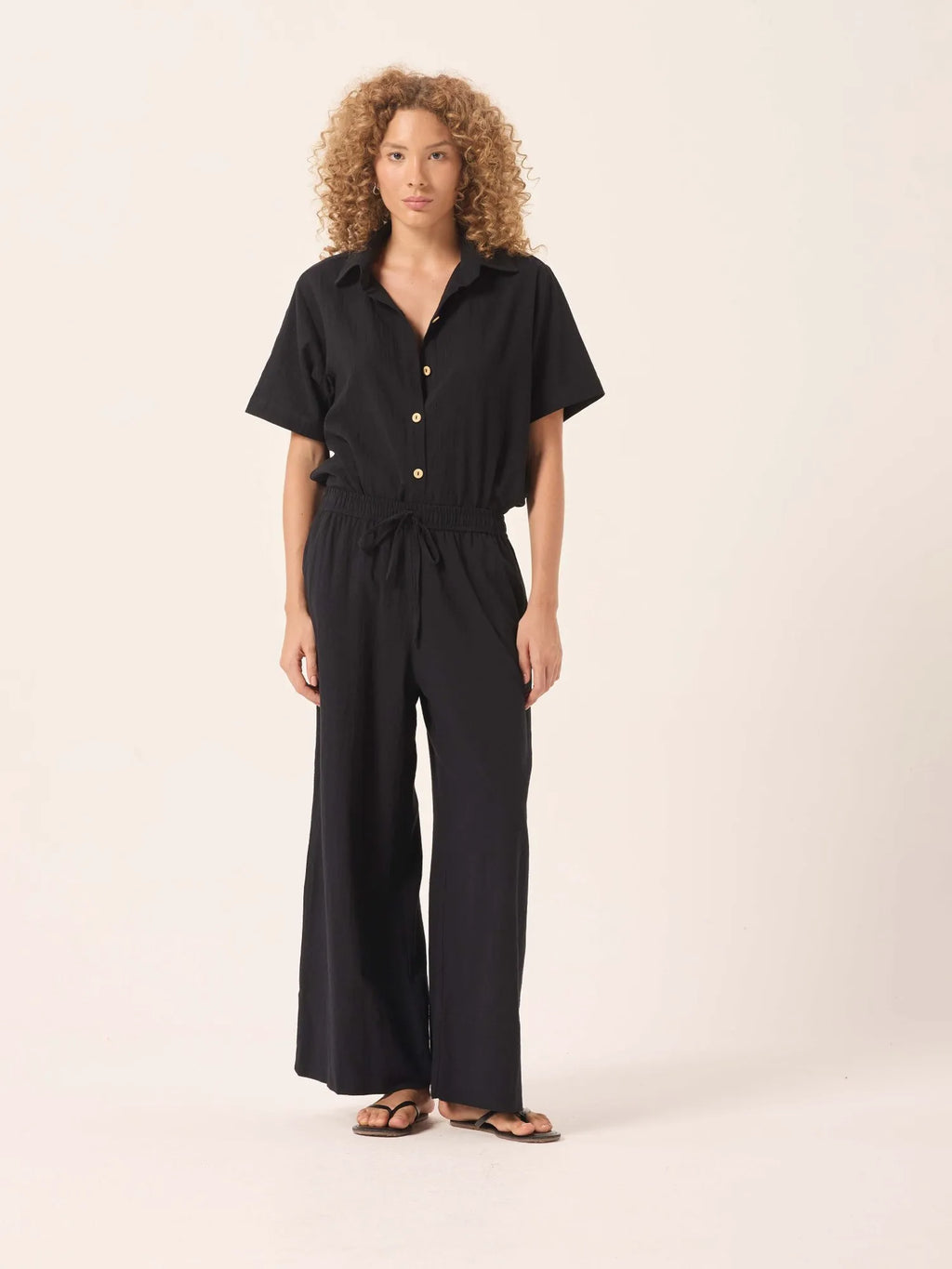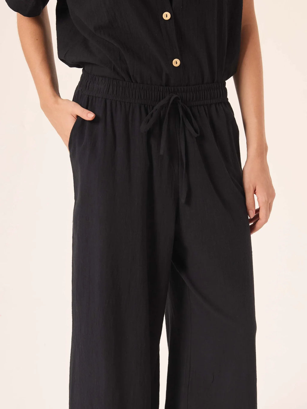 Calça ampla tipo pantalona confeccionada em algodão, com toque leve, natural e caimento fluido. Possui cós de elástico com amarração em rolotê, que garante ajuste confortável ao corpo e praticidade no vestir. Os bolsos laterais trazem funcionalidade ao design, enquanto a pala larga na barra adiciona acabamento sofisticado e movimento à peça.