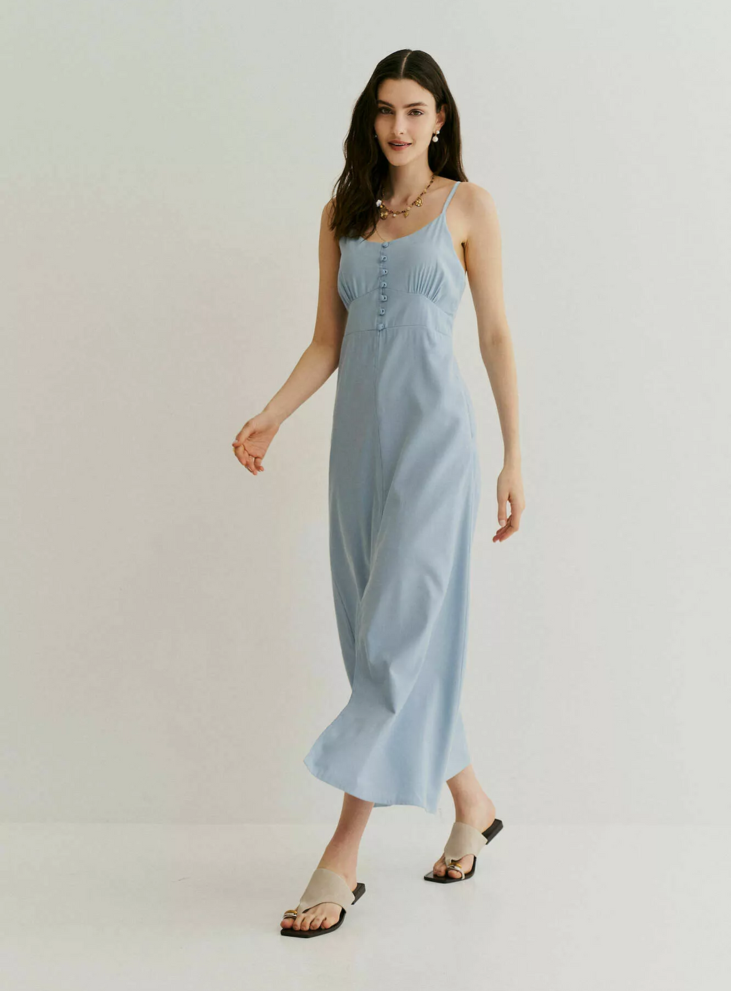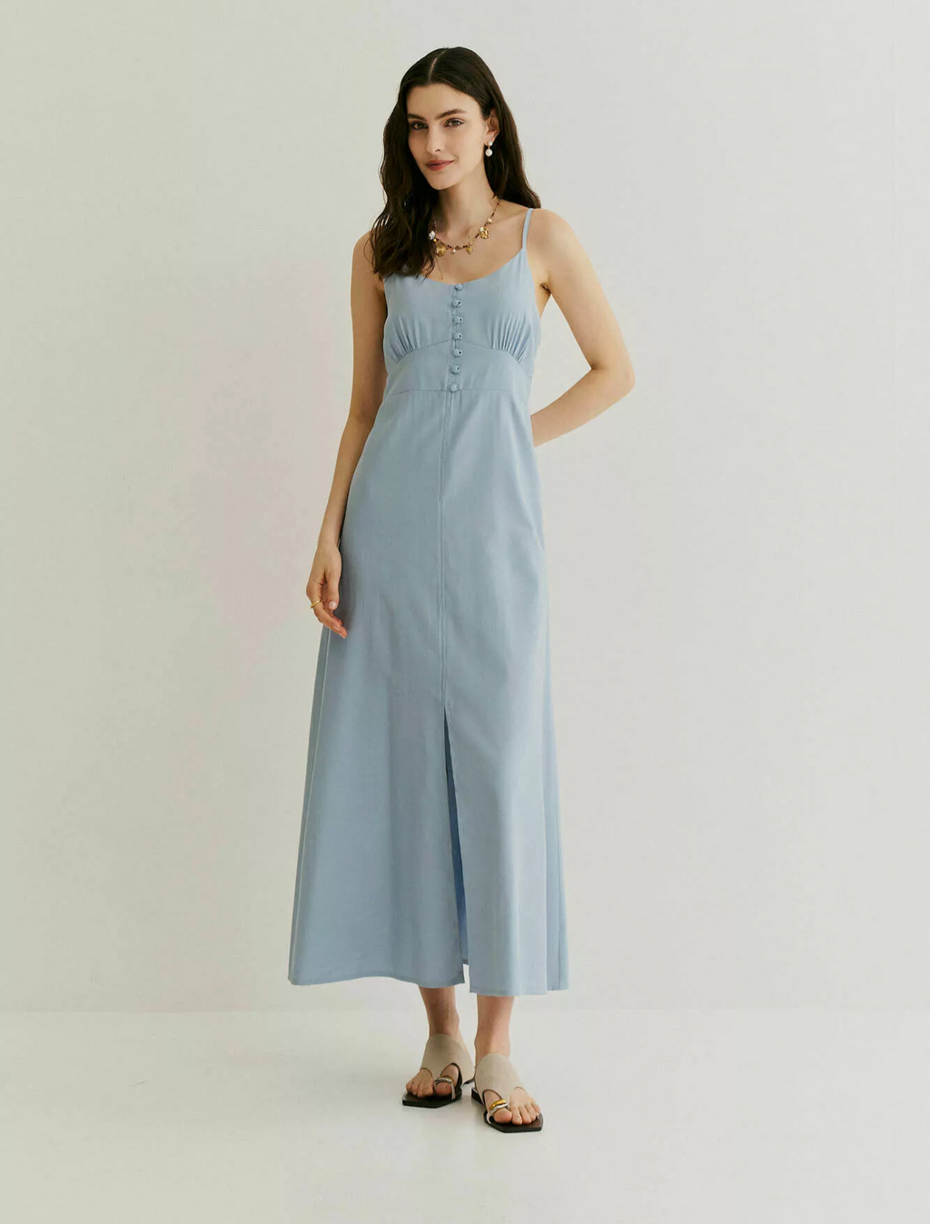 As alcinhas finas reguláveis permitem personalizar a altura, enquanto a fenda frontal traz leveza e movimento para o look.