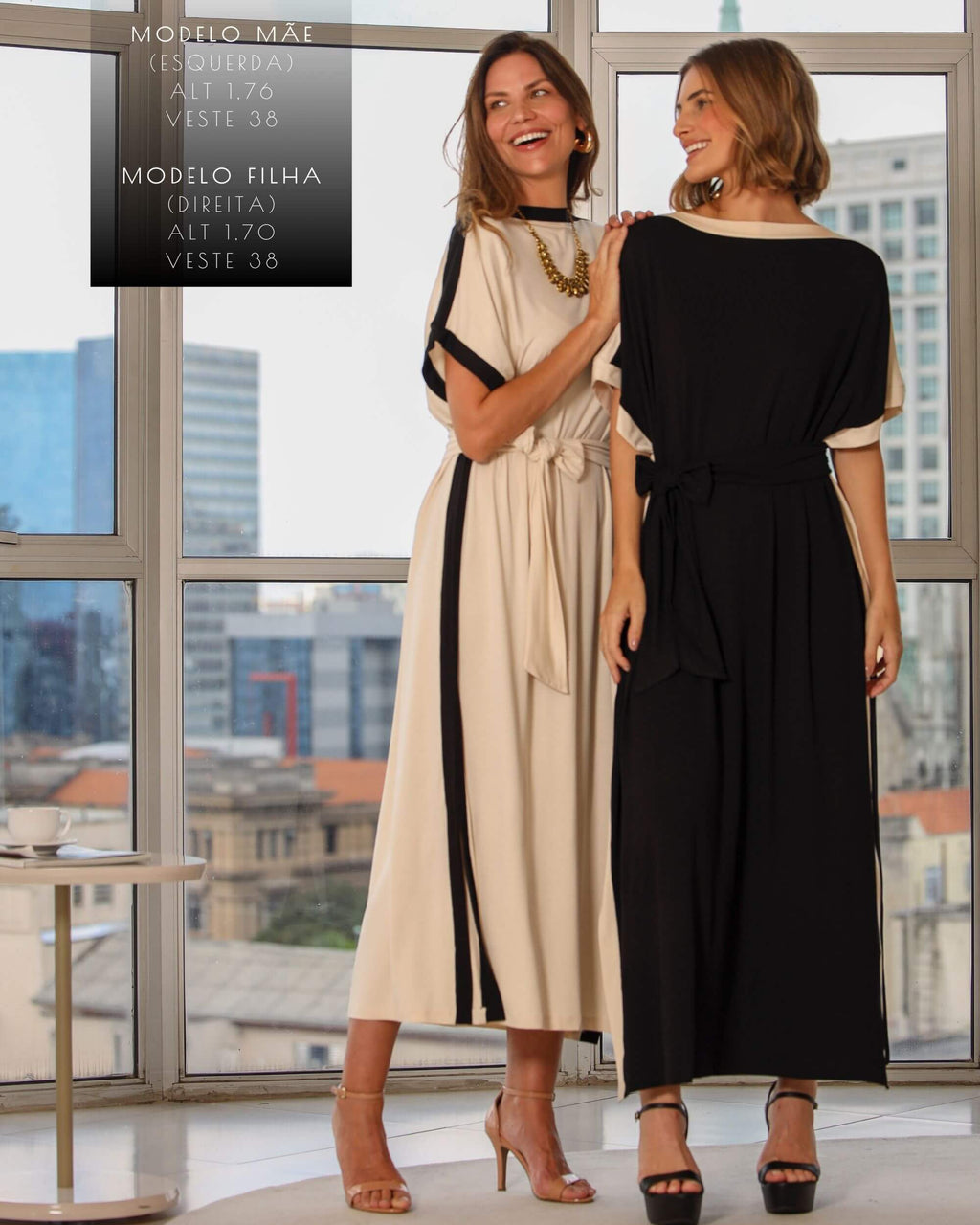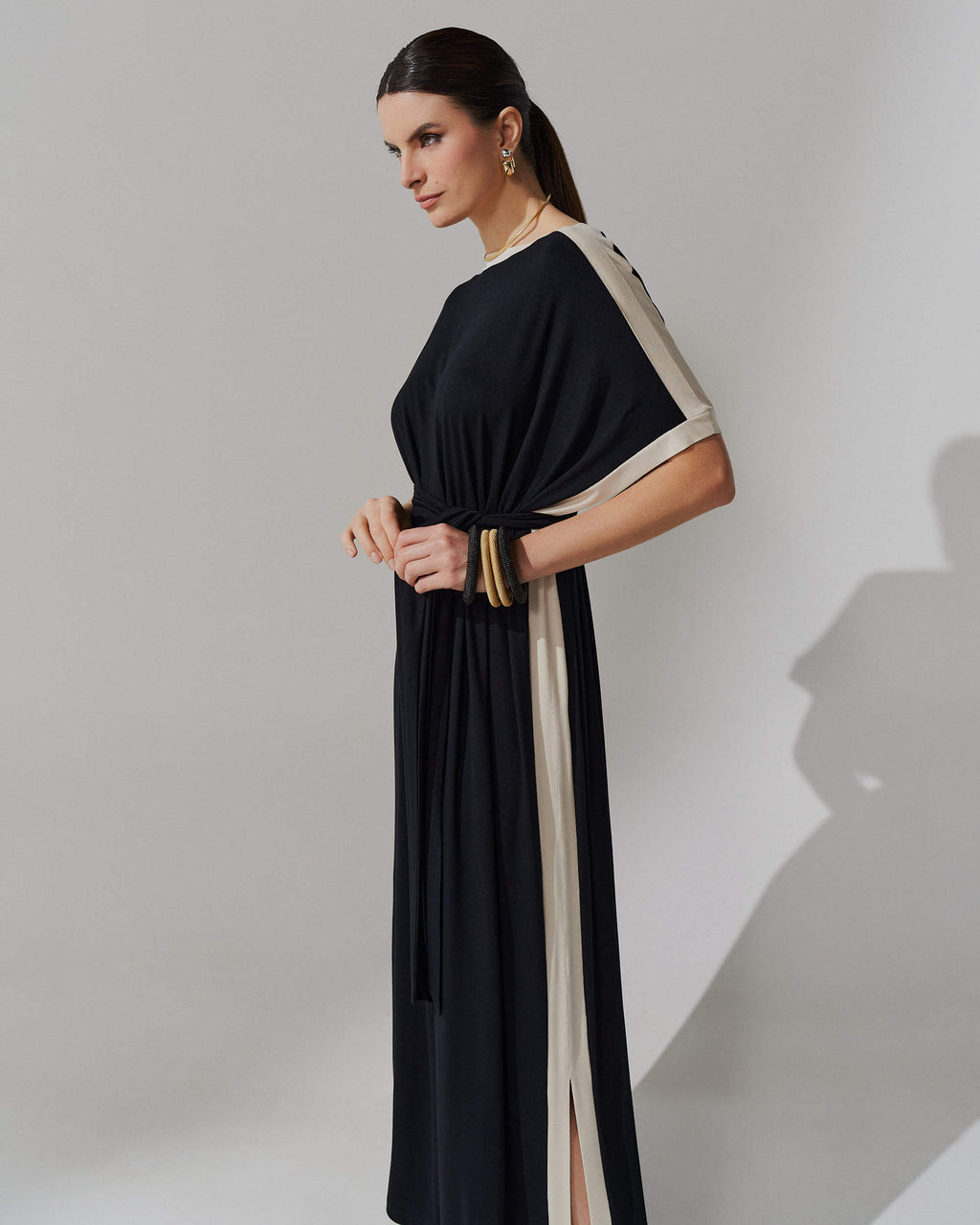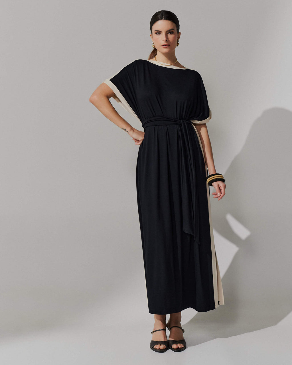 Seu design bicolor com recortes estratégicos nas laterais e mangas cria um efeito visual alongador, enquanto a modelagem ampla com fenda sutil garante movimento e elegância. O decote canoa valoriza o colo com delicadeza, e a faixa do mesmo tecido permite ajustar a silhueta como preferir — mais solta ou marcada na cintura.