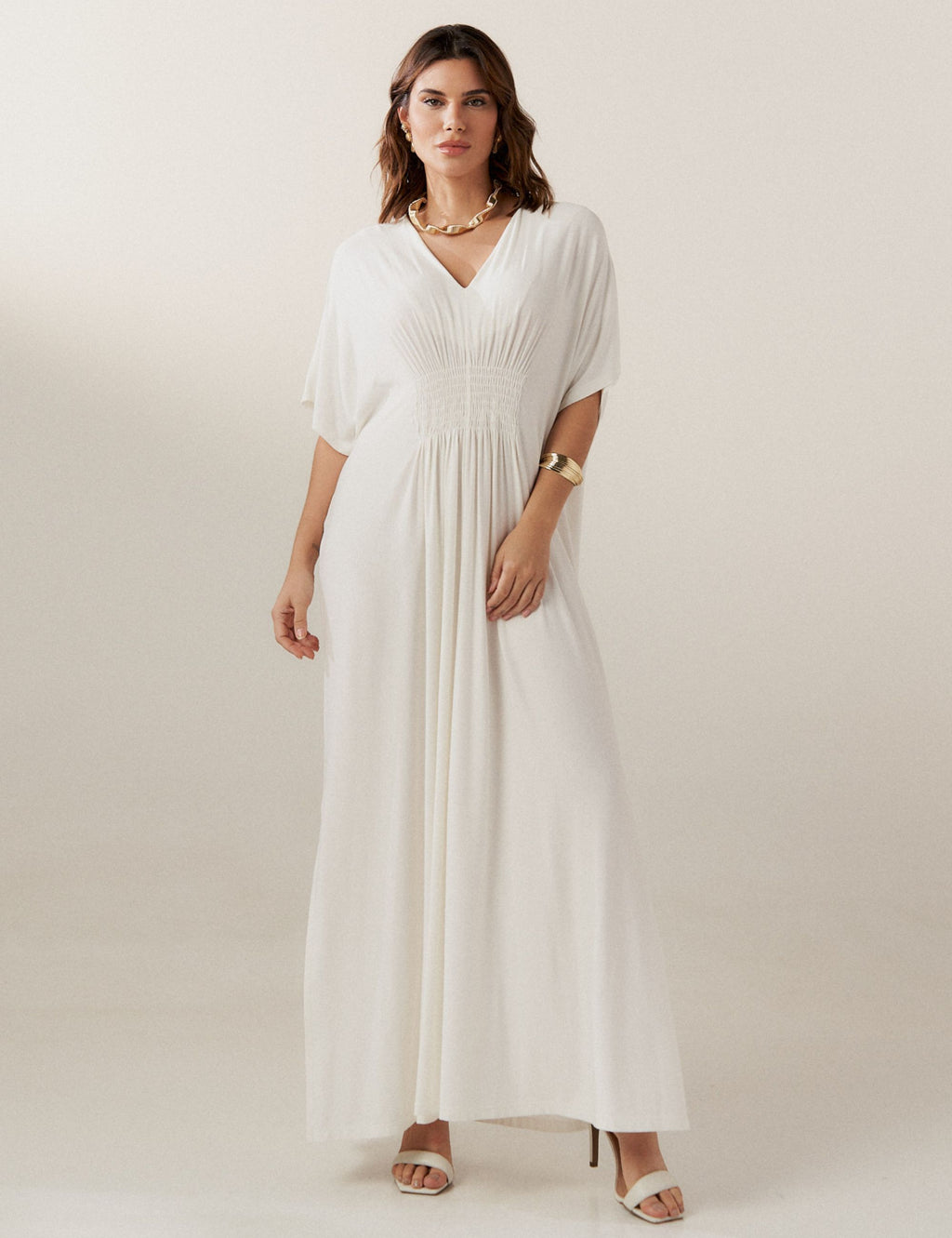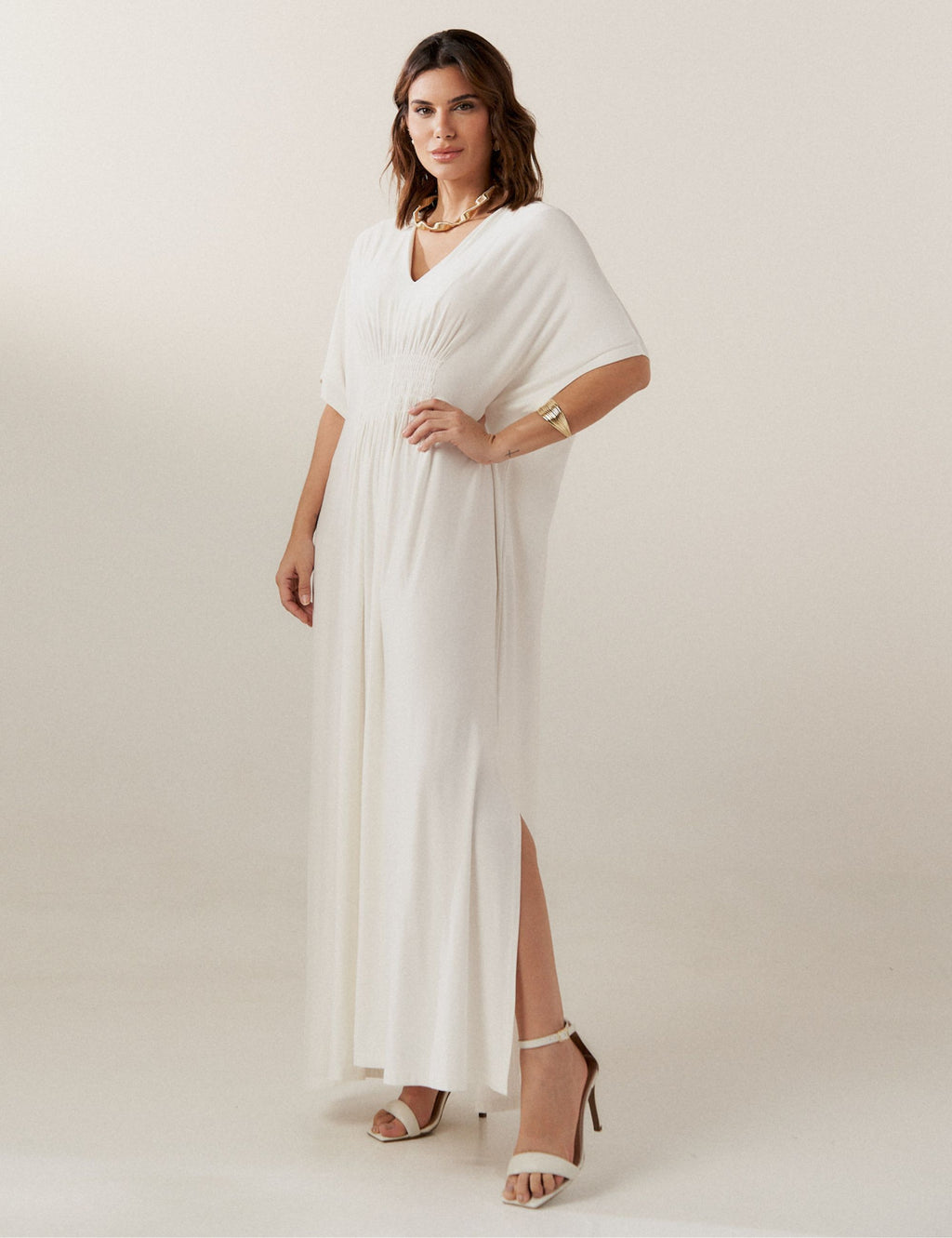 Confeccionado em malha MVS, oferece toque macio, leveza e caimento impecável. O decote em V alonga a silhueta, enquanto o lastex na frente e nas costas cria franzidos delicados que realçam as curvas com naturalidade.
